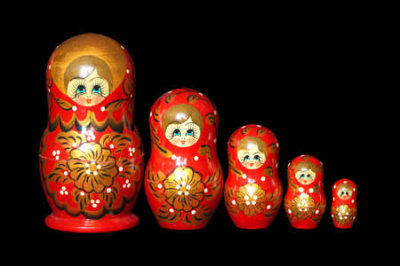 Five Red Painted Russian Nesting Dolls toys isolated on black closeup