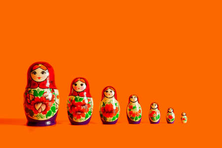 Family nesting dolls in a row stand on an orange background. Isolate.