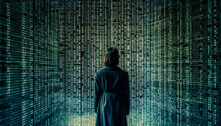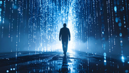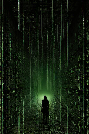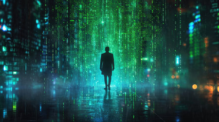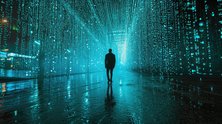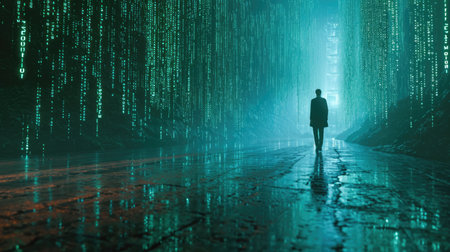 The picture of the single person that has been walking into the endless walkway that has been raining with the digital matrix green binary rain of code that seem like person search something. AIGX01.