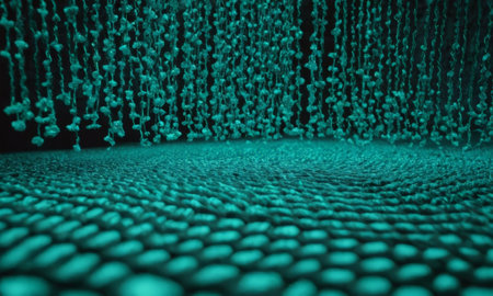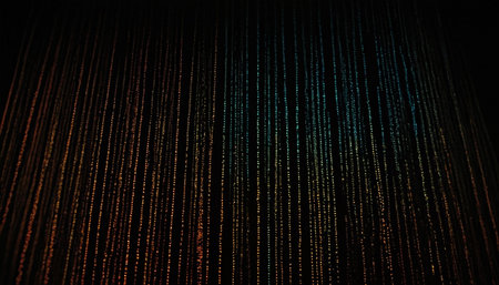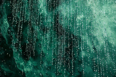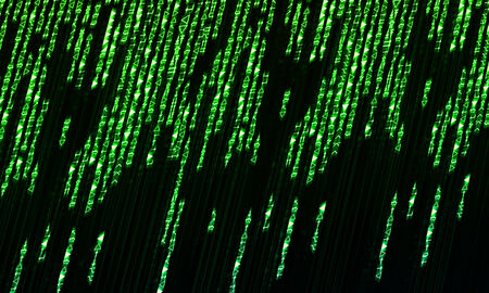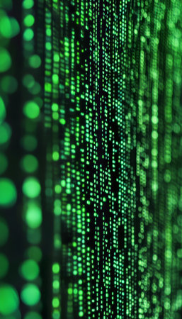 A photo depicting a multitude of green and white dots arranged on a black background, Binary code falling like rain in the Matrix, AI Generated