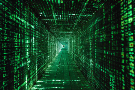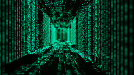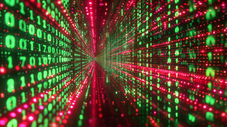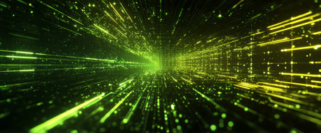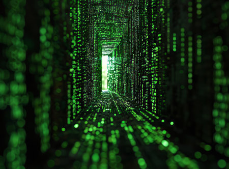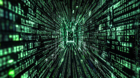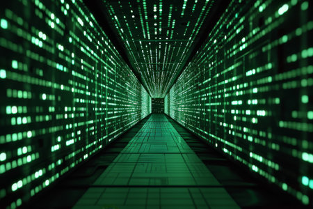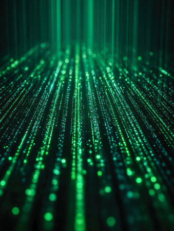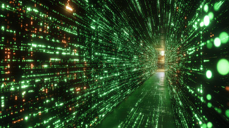 A mesmerizing digital matrix scene with flowing green data, creating a cybernetic ambiance. Ideal for concepts related to technology, data visualization, and digital art.