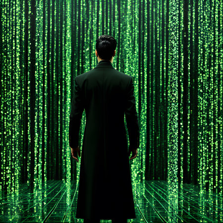 A solitary figure stands in a vast, futuristic digital city bathed in green light, with streams of binary code falling from above like rain.