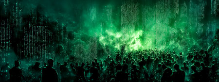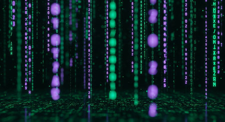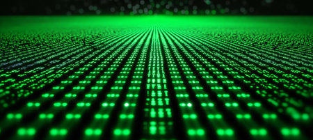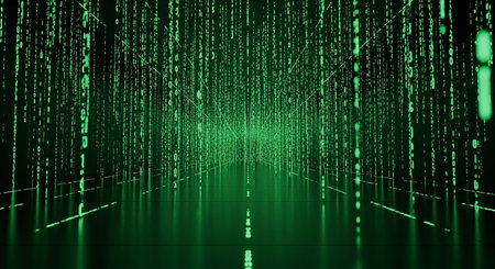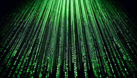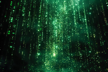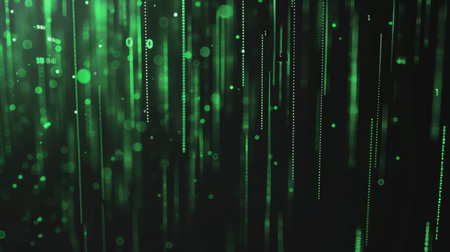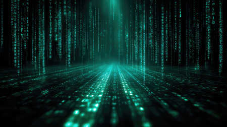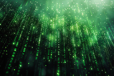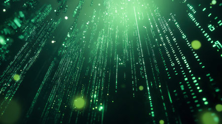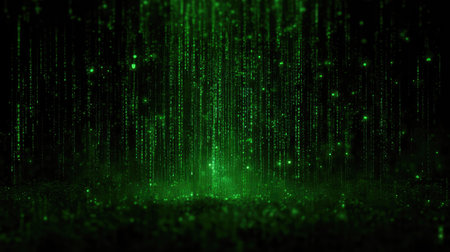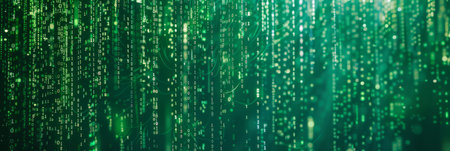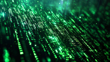 Captivating green digital matrix background featuring glowing binary code and abstract patterns. Ideal for technology and science themed projects.