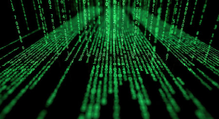 Glowing green digital matrix code with binary numbers representing technology, cyberspace, and data flow.