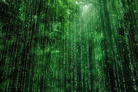 A dense forest filled with numerous towering green trees, showcasing the vibrant colors of spring, Binary code falling like rain in the Matrix, AI Generated