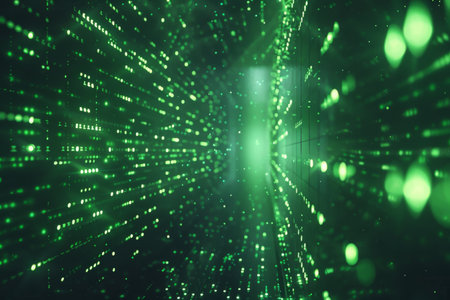 Vibrant green abstract background filled with glowing lights, creating a dynamic visual effect that symbolizes technology and innovation in a digital realm