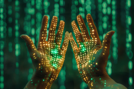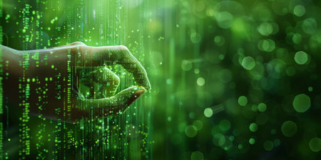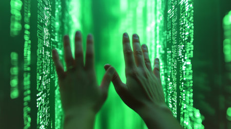 A digital hand surrounded by glowing green data streams in a futuristic concept of technology and virtual interaction. With Generative AI technology.