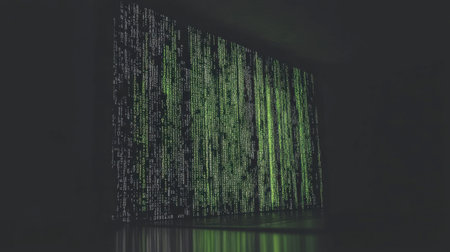 A captivating view of a green digital matrix coding wall illuminated in a dark space, representing technology and futuristic innovation.