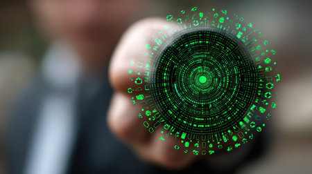 An individual holds a glowing digital symbol, likely representing data or technology. The image shows a close-up, the symbol is circular with green illumination. It may be used to illustrate concepts related to technology, innovation, or future developments in various commercial or editorial contexts.