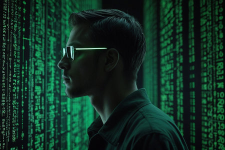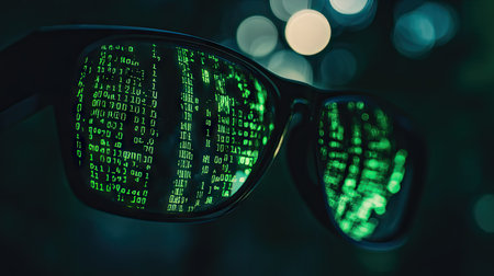 Hacker-style dark ambiance with glasses reflecting green terminal commands, evoking cybersecurity and hacking themes