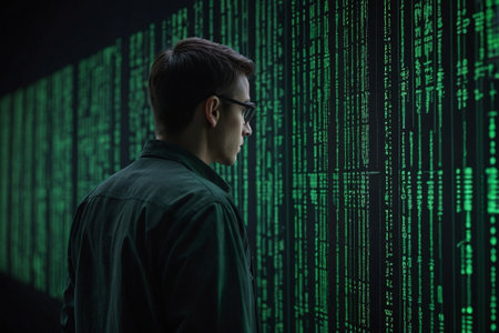 Lone figure illuminated by radiant lines of binary code in dark setting. Symbolizes intersection of humanity and digital world. Glowing streams of data surround person, technology and cybersecurity