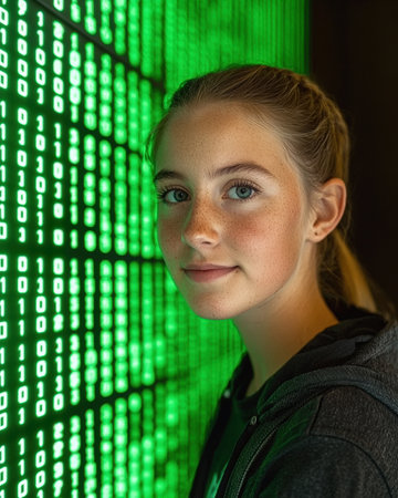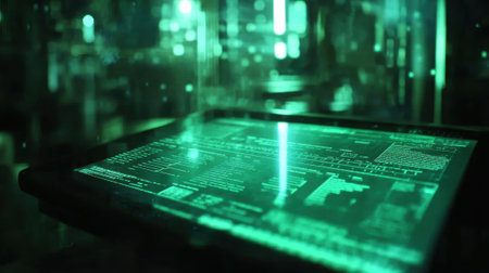 Experience a dynamic digital realm illuminated by green binary code and intricate patterns, evoking a sense of advanced technology and innovation with every pixel.