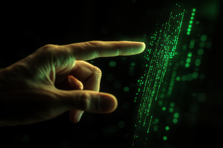 A pair of hands are reaching out to touch a green screen with a lot of numbers on it. Concept of curiosity and wonder as the viewer tries to understand the meaning behind the numbers