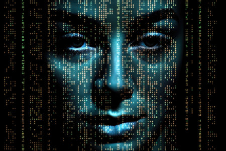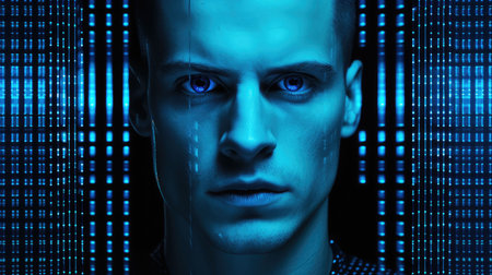 A binary code with human face shape on dark background. Generative AI AIG27.