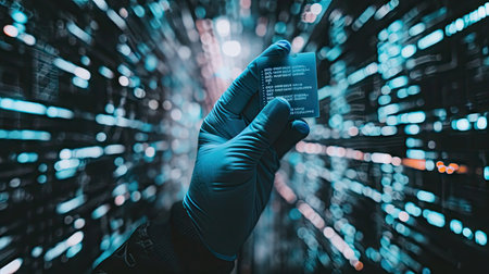 The picture of the single person that has been walking into the endless walkway that has been raining with the digital matrix green binary rain of code that seem like person search something. AIGX01.