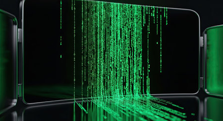 Green glowing binary code raining down on a dark background, symbolizing cyberspace and programming.