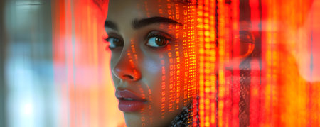 Woman, Programming, Code. Digital Overlay, Cybersecurity Concept. Technology Background.