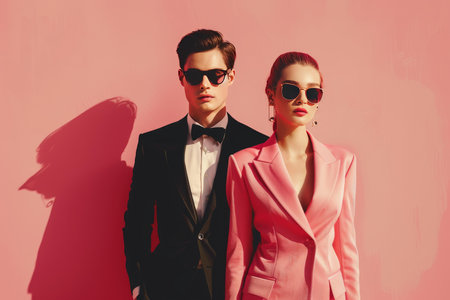 Elegant man and woman in trendy suits and shades posing against a pink wall, casting shadows