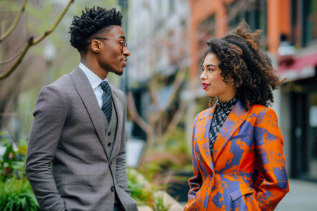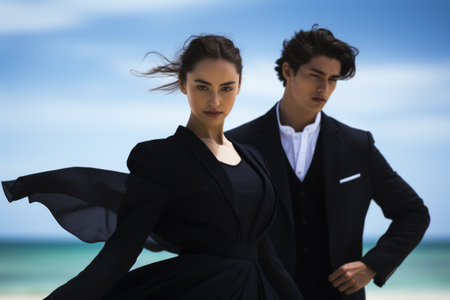 A fashionable couple stands hand in hand, embodying love and connection in a stunning setting.