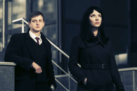 Close portrait of a smiling attractive business young couple working together, outdoor shoot