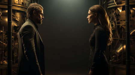 Elegant couple exuding luxury and style in a glamorous setting, captured against a dark backdrop.