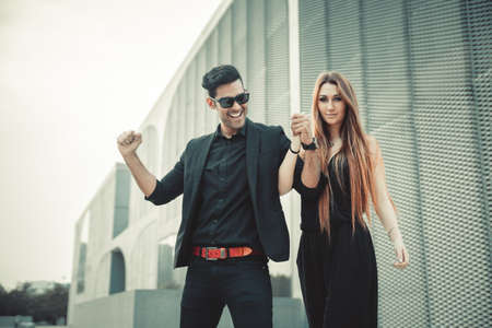 Young trendy man and woman models smiling feeling happy. Fashion Style