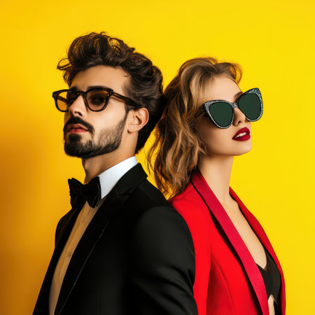 Stylish man and woman stand back to back wearing trendy sunglasses. Their fashionable outfits feature elegant black and vibrant red colors.