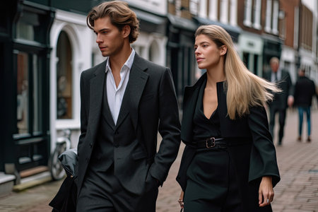 two people walking down the street, one is wearing a black suit and the other is wearing a white shirt. Generative Ai