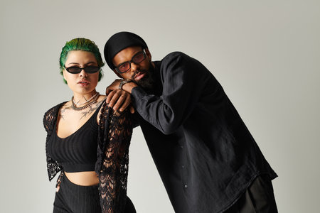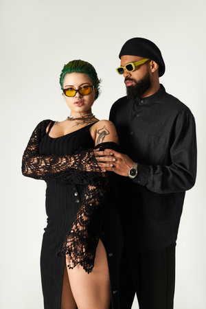 A trendy couple poses confidently in a studio, flaunting their stylish outfits and sunglasses.