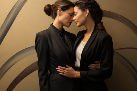 Happy female couple non-traditional orientation, lesbian, LGBT, romantic relationship of two girls. Love serious commitment.