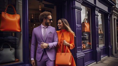 A stylish couple one in a chic dress and the other in a sharp suit exit a designer boutique. The woman's bag is a lively shade of lilac while the man's is a vibrant shade of coral. Both are laughing heartily clearly delighted with their purchases.