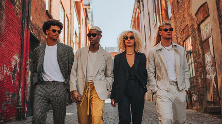 Three diverse models pose confidently in an urban setting, showcasing modern fashion styles. The vivid graffiti and textured brick background add an artistic flair to their look.