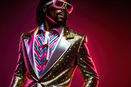 Beauty Fashion Model Young African American Male Wearing Sunglasses, Bright Shiny Patent Leather Clothes in Disco Style