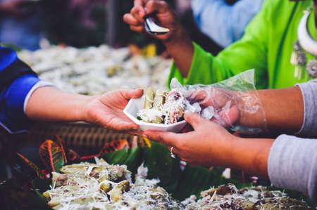 The hands of beggars offer food from the donor : The life of the poor : The concept of feeding