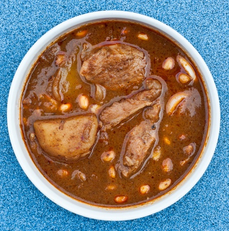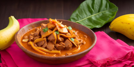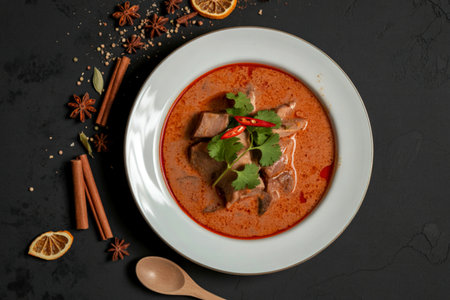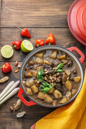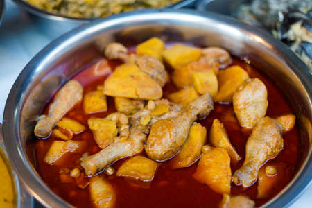 Fresh prepared spicy red massaman curry with chicken and potatoes on local market in Bangkok. Traditional thai cuisine made of fresh ingredients.