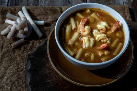 boiled spicy mackerel fish entrails with vegetable curry soup Thai southern style food and rice noodles on plate