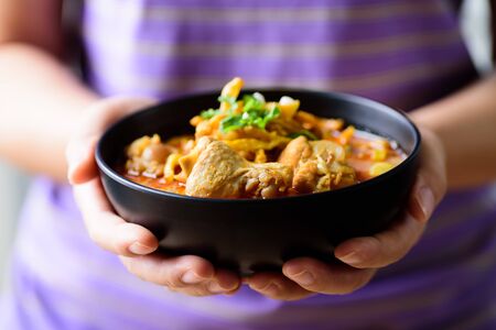 Traditional Northern Thai food (Khao Soi), spicy curry noodles soup with coconut milk and chicken in a bowl holding by hand