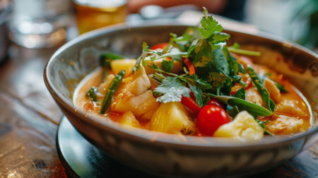 A mouthwatering bowl of Kaeng Som, Thai sour curry with fish, pineapple, tomatoes, and herbs, offering a perfect balance of tangy and spicy flavors.