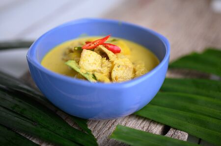 chicken curry or kari ayam served on bowl, isolated on wood background