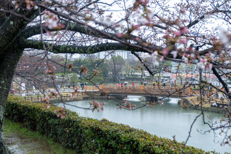 Cherry blossom tree branch closeup, people with umbrellas on Himeji entrance bridge, rainy Spring day in Japan