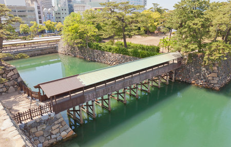 TAKAMATSU, JAPAN - MAY 22, 2015: Saya-bashi bridge of Takamatsu castle, Shikoku Island, Japan. Constructed in 1640, reconstructed in 2011