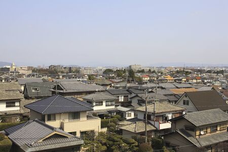 Japan dense residential area houses roofs background. Japan real estate housing background