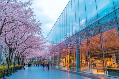 Elegant side view of upscale mall featuring glass stores and blooming cherry blossom trees