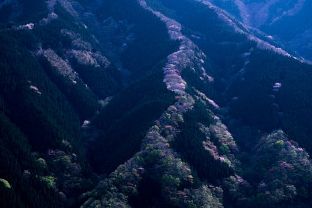 Cherry blossoms in full bloom in the mountains and forest landscape