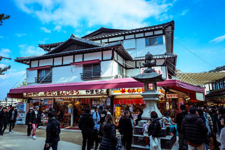Miyajima, Japan - January 02, 2020: Cityscape to the Walking Tourists and Itsukushima streets
