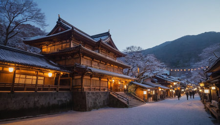 A serene Japanese village with traditional wooden buildings and tiled roofs covered in snow. Lanterns cast a warm glow on the street at dusk.