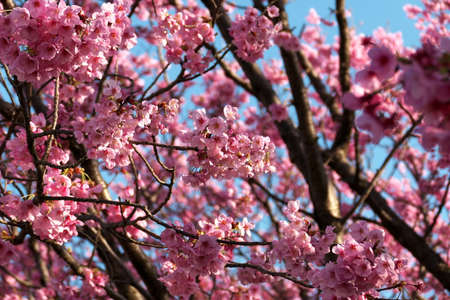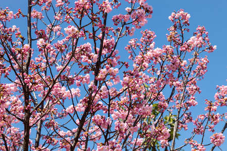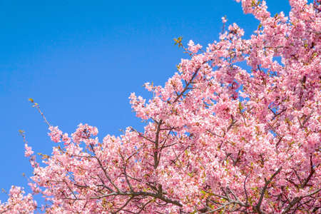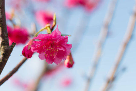 Bokeh background image of wild Himalayan Cherry , Sakura , Cherry Blossoms grows in the mountains and creates fabulous pink blossoms each winter at Northern Thailand on blue sky background.