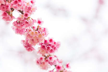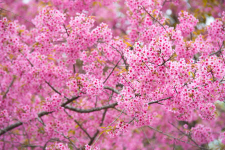 Close up background image of Wild Himalayan Cherry In the winter, Chiang Mai, Thailand. The flowers have pink color in a soft tone with low contras. Feeling fresh and relax. There is a copy space.