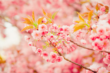 Spring pink vibrant cherry blossoms branch close-up