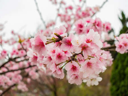 Cherry blossom flower in blooming with branch isolated on blurred background for spring season in Taipei, Taiwan.